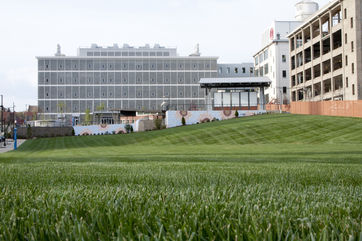 In 2013, the Innovation Quarter and Stimmel teamed up with STITCH Design Shop, at the time an up-and-coming local architecture firm looking to gain a foothold in the market, to help design the structures for the upper lawn. This included the amphitheater and a bathroom, office/storage building.