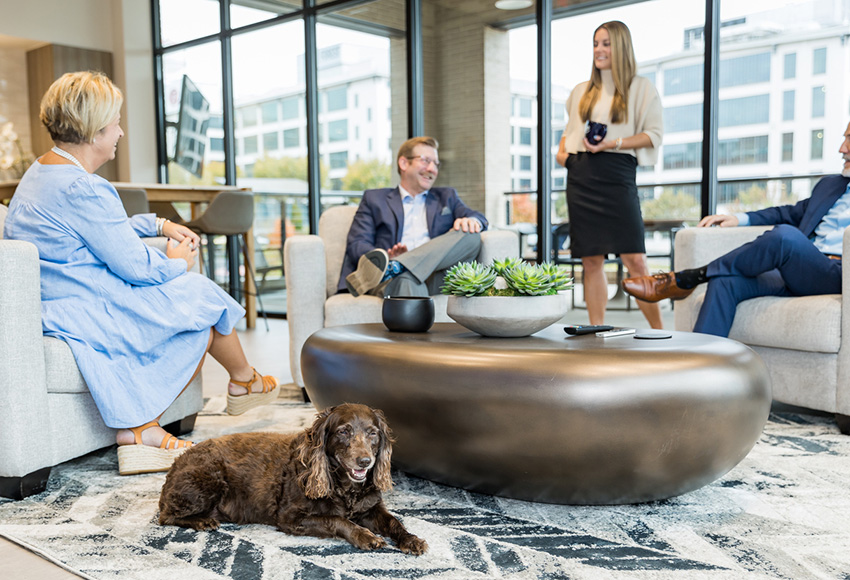 Encore Bank is located on the second floor of Bailey South in the iQ, just above Barcelona Burger. When you walk in the door, a real, live human being greets you at the door (and, occasionally, Smith’s Boykin Spaniel, Cocco) and ushers you into a space that looks less like a bank and more like a swanky living room.