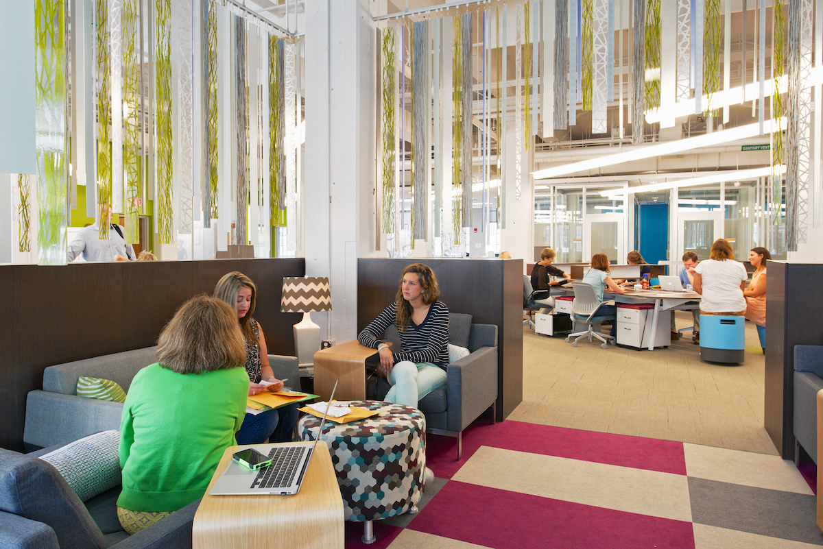 Different employees succeed in different working environments, which is reflected in the shift from Office Space-style cubicles to the open-plan designs often found throughout innovation districts. Whether that’s coworking spaces or private suites, modern and well-designed spaces can inspire and promote innovation. Having a variety of workspaces to choose from helps workers flourish on any given day. The creativity-prone might benefit from open, collaborative areas where they can bounce ideas off coworkers, while introverts may appreciate spaces reserved for unwinding and recharging. Contemporary office design offers flexibility and a place to help every personality succeed.