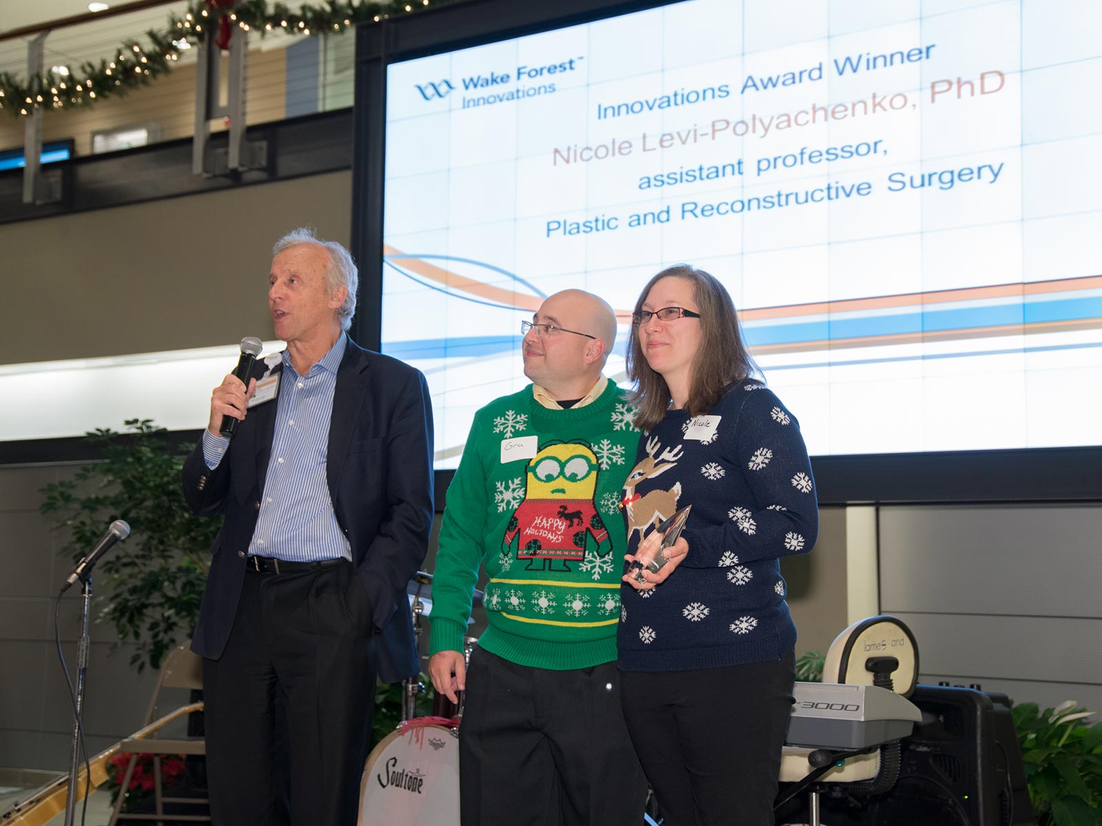 The Innovation Award, which celebrates individuals whose work impacts lives and improves patient care, was presented to Nicole by Eric Tomlinson, DSc, PhD, chief innovation officer of Wake Forest Baptist Medical Center and president of Wake Forest Innovation Quarter, at last December’s Network Night held at Biotech Place.