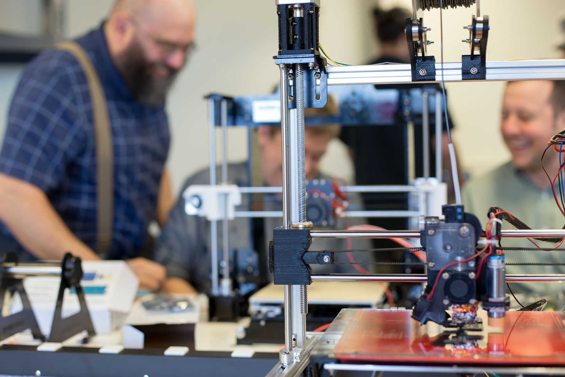 A woman sits at the entrance of the garage, putting a spinning wheel into motion with her feet, as she converts wool into yarn. The heavier whirring of the traditional machine undergirds the lighter buzzing and chirping of a tabletop 3D printer stationed in the middle of the room. Its operator offers instruction to two other men who are building a 3D printer of their own from scratch.
