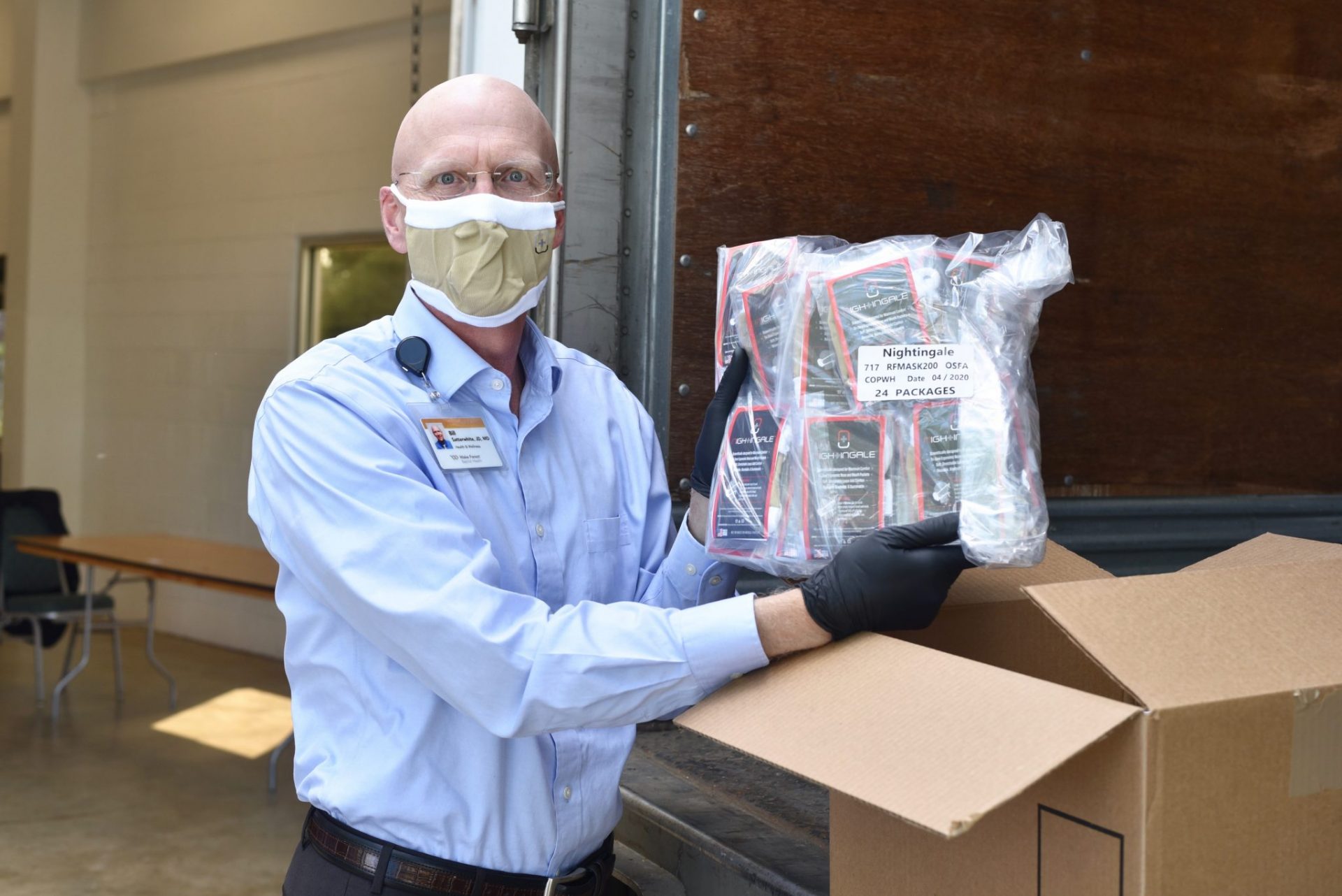 Bill Satterwhite, MD, chief wellness officer at Wake Forest Baptist Health, shows off the first shipment of masks that arrived in Winston-Salem just weeks after his team started ideating.